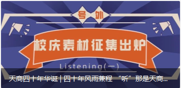 四十年风雨兼程四十年光辉岁月天商迎来了属于她自己的四十周年的纪念日为了弘扬天商精神让更多的天商人分享这份喜悦我们发起了40周年校庆素材征集活动共同祝福我们的母校。